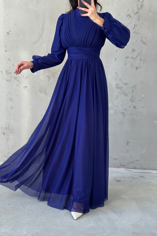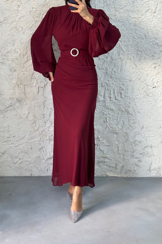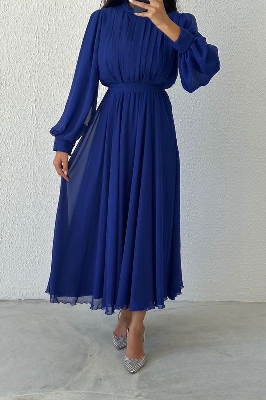 Chiffon Fabric Pleated Belt Detailed Evening Dress 4632