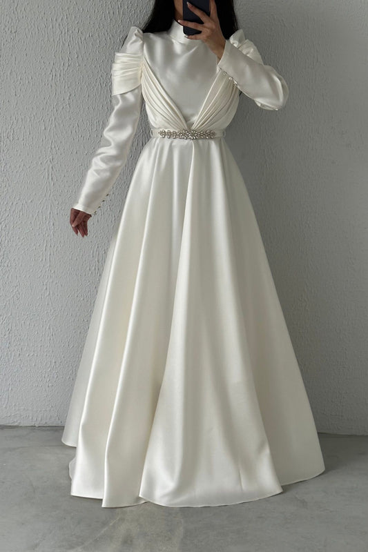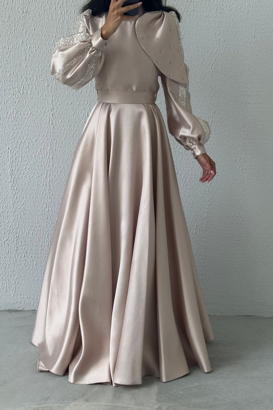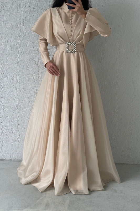 Cape Detailed Chic Flowing Satin Balloon Sleeve Evening Dress 0016