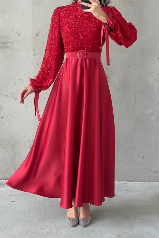 Embroidered Top Detail Belted Satin Evening Dress 6176