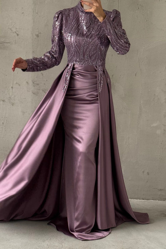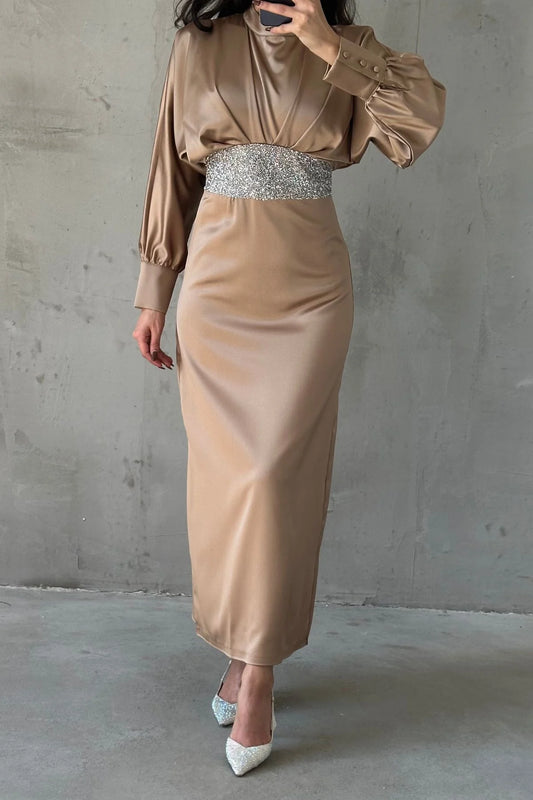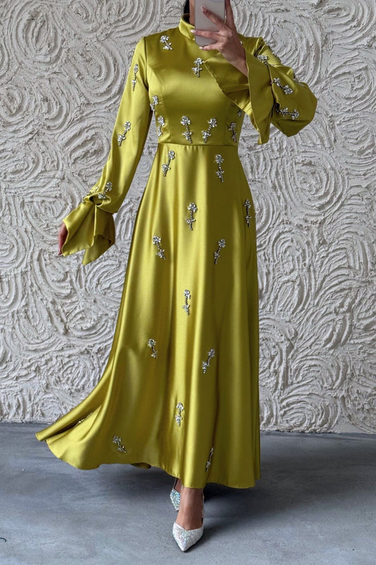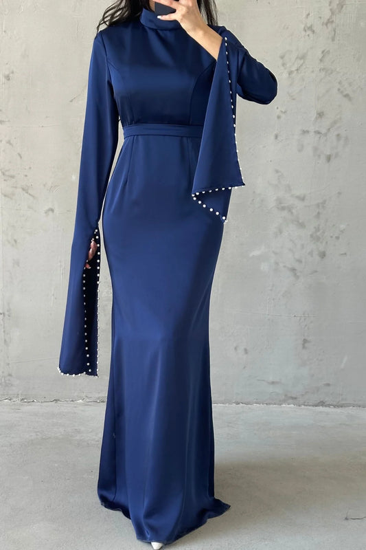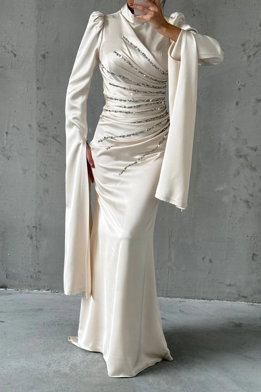 Satin Evening Dress with Slit Sleeves and Pearl Detail on the Sleeves 4202