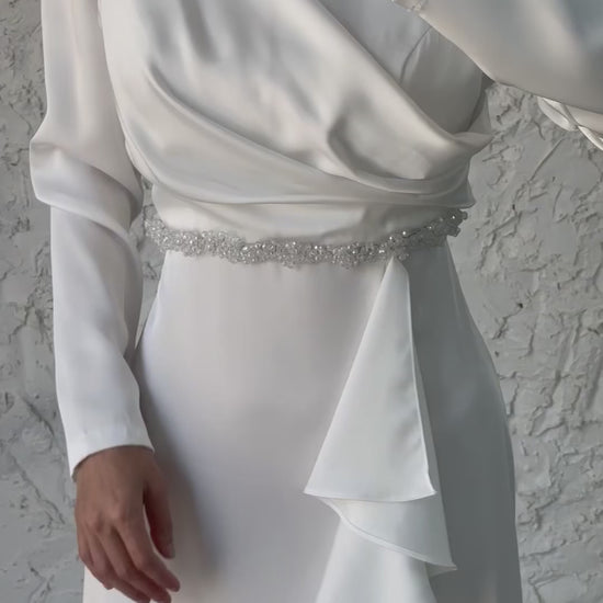 Elegant and refined, the Satin Draped Ruffle Bridal Evening Dress 6666 brings a modern twist to timeless sophistication. Featuring a beautifully draped bodice, structured shoulders, and a sparkling embellished waistband, this gown effortlessly sculpts a flattering silhouette. The highlight of the design is the cascading side ruffle, adding soft movement and a hint of romance to the sleek, floor-length skirt. Perfect for weddings, receptions, or formal evenings where you want to make a graceful impression.